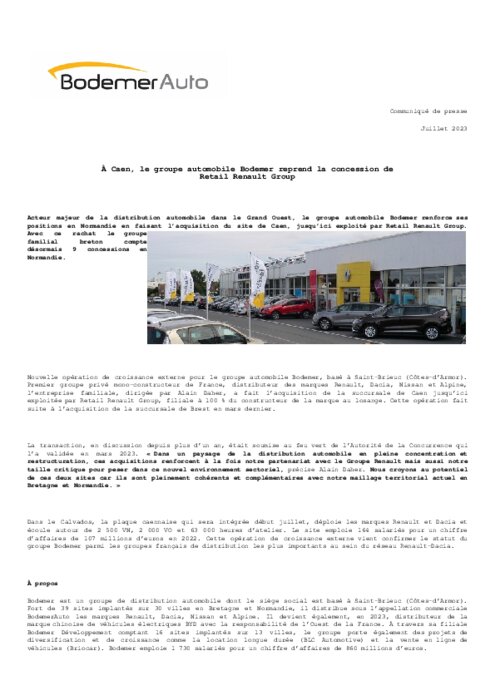 Acteur majeur de la distribution automobile dans le Grand Ouest, le groupe automobile Bodemer renforce ses positions en Normandie en faisant l’acquisition du site de Caen, jusqu’ici exploité par Retail Renault Group. Avec ce rachat le groupe familial breton compte désormais 9 concessions en Normandie.