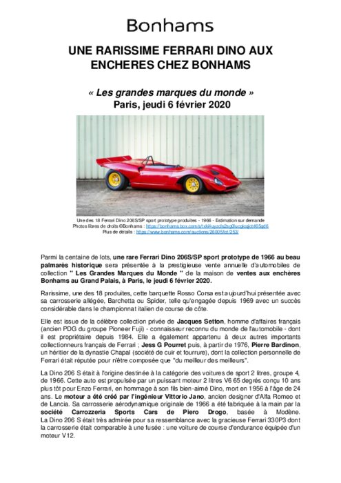 Parmi la centaine de lots, une rare Ferrari Dino 206S/SP sport prototype de 1966 au beau palmarès historique sera présentée à la prestigieuse vente annuelle d’automobiles de collection " Les Grandes Marques du Monde " de la maison de ventes aux enchères Bonhams au Grand Palais, à Paris, le jeudi 6 février 2020.