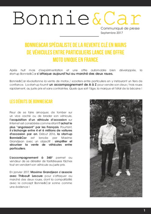 Bonnie&Car révolutionne la vente de motos / scooters entre particuliers en y instaurant un tiers de confiance. La start-up fournit un accompagnement de A à Z pour vendre son deux / trois roues rapidement, au juste prix et sans contraintes. Quels que soit l'âge, la marque et l'état de la bécane !