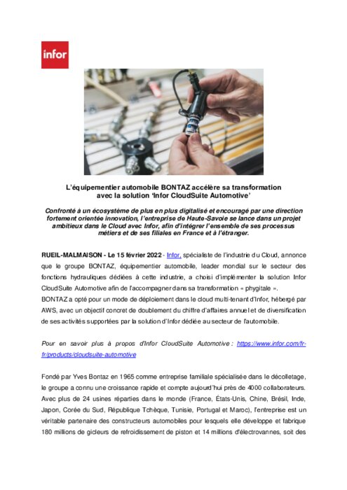 Infor, spécialiste de l’industrie du Cloud, annonce que le groupe BONTAZ, équipementier automobile, leader mondial sur le secteur des fonctions hydrauliques dédiées à cette industrie, a choisi d’implémenter la solution Infor CloudSuite Automotive afin de l’accompagner dans sa transformation « phygitale ». BONTAZ a opté pour un mode de déploiement dans le cloud multi-tenant d’Infor, hébergé par AWS, avec un objectif concret de doublement du chiffre d’affaires annuel...