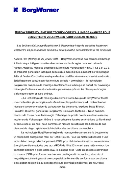 BORGWARNER - TECHNOLOGIE D’ALLUMAGE POUR VOLKSWAGEN FABRIQUES AU MEXIQUE