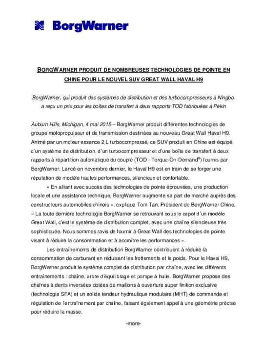 BorgWarner, qui produit des systèmes de distribution et des turbocompresseurs à Ningbo, a reçu un prix pour les boîtes de transfert à deux rapports TOD fabriquées à Pékin. BorgWarner produit différentes technologies de groupe motopropulseur et de transmission destinées au nouveau Great Wall Haval H9.