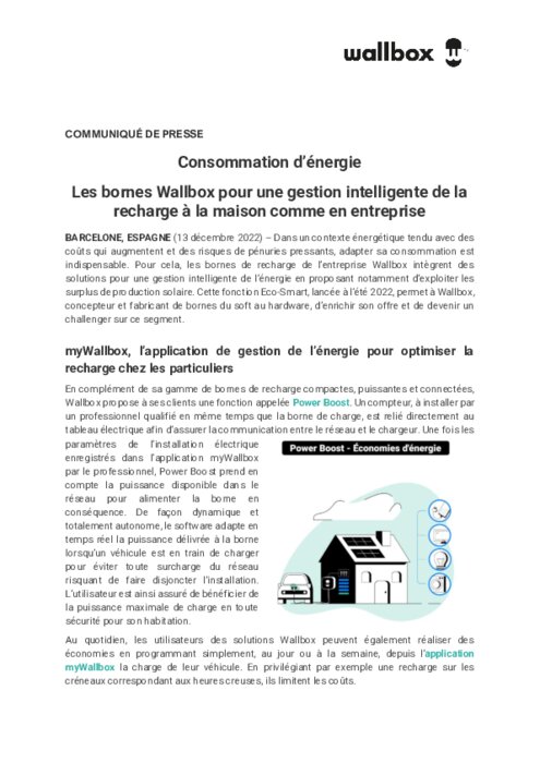 Dans un contexte énergétique tendu avec des coûts qui augmentent et des risques de pénuries pressants, adapter sa consommation est indispensable. Pour cela, les bornes de recharge de l’entreprise Wallbox intègrent des solutions pour une gestion intelligente de l’énergie en proposant notamment d’exploiter les surplus de production solaire. Cette fonction Eco-Smart, lancée à l’été 2022, permet à Wallbox, concepteur et fabricant de bornes du soft au hardware, d’enrichir son offre.