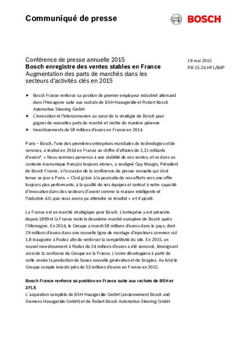 Avec une augmentation des parts de marchés dans les secteurs d’activités clés en 2015, Bosch France renforce sa position de premier employeur industriel allemand dans l’Hexagone suite aux rachats de BSH Hausgeräte et Robert Bosch Automotive Steering GmbH. L’innovation et l’interconnexion sont au cœur de la stratégie de Bosch pour gagner de nouvelles parts de marché et croître de manière pérenne. Les investissements se montent à 58 millions d’euros en France en 2014.