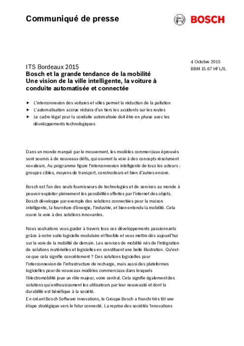 Bosch équipe de radars le véhicule Citroën C4 Picasso présentée à l’ITS Bordeaux par PSA Peugeot Citroën. Bosch coopère avec PSA pour développer la conduite automatisée. Sur le véhicule Citroën C4 Picasso présenté à l’ITS, Bosch fournit 6 radars dont 2 radars à longue portée, positionnés à l’avant et à l’arrière du véhicule, et 4 radars moyenne portée, positionnés aux 4 coins de la voiture. Grace à ces capteurs, la Citroën C4 Picasso peut détecter des objets sur sa file et les autres.