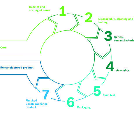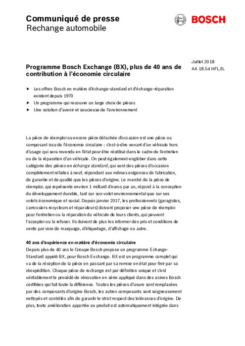 Depuis plus de 40 ans le Groupe Bosch propose un programme Echange-Standard appelé BX, pour Bosch Exchange. BX est un programme complet qui va de la réception de la pièce en passant par sa remise en état pour finir par sa réexpédition. Chaque pièce de rechange est par définition unique et c’est véritablement le procédé de rénovation en série appliqué dans des usines Bosch certifiées qui fait toute la différence. Toutes les pièces d’usure sont remplacées par des composants d’origine Bosch...