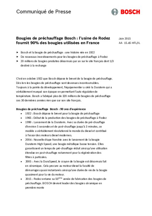 C’est en octobre 1922 que Bosch dépose le brevet de la bougie de préchauffage. Dès lors les bougies de préchauffage sont devenues incontournables. Toujours à la pointe du développement, l’équipementier a créé la Duraterm qui a véritablement marqué son époque en permettant l’auto régulation de température. Bosch a fabriqué plus de 320 millions de bougies de préchauffage ces 30 dernières années rien que sur son site français.