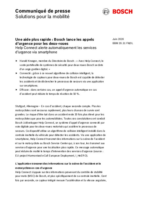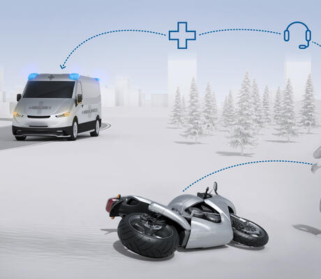 Bosch à développer Help Connect, un système d'appel d’urgence connecté par voie digitale pour les deux-roues motorisés qui accélère le processus de secours. Ce dispositif utilise un algorithme de collision intelligent installé dans la centrale inertielle du véhicule pour détecter les accidents. Via une application de smartphone, Help Connect transmet des informations sur la scène de l’accident et sur le motocycliste au Bosch Service Center qui, à son tour, les transmet aux services d’urgence...