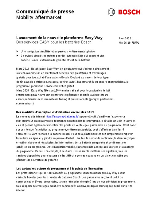 Le nouveau site internet easyway-batteries a pour objectif d’améliorer l’expérience utilisateur tout en conservant le fonctionnement familier du programme. Il détaille ainsi les 2 services clés et permet également d’identifier les points de vente et/ou partenaires du programme. C’est donc sur ce site que l'inscription au programme, entièrement gratuite, peut s’effectuer dans les 4 semaines suivant l'achat de la batterie Bosch.
