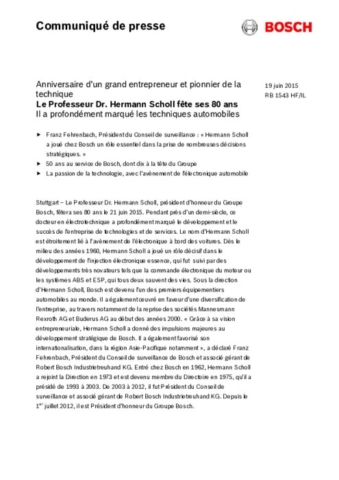 Le Professeur Dr. Hermann Scholl, président d’honneur du Groupe Bosch, fêtera ses 80 ans le 21 juin 2015. Pendant près d’un demi-siècle, ce docteur en électrotechnique a profondément marqué le développement et le succès de l’entreprise de technologies et de services. Le nom d’Hermann Scholl est étroitement lié à l’avènement de l’électronique à bord des voitures.