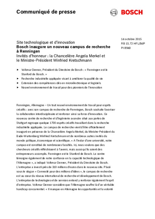 Un tout nouvel environnement de travail pour esprits créatifs : avec son campus de recherche de Renningen, Bosch souhaite favoriser la collaboration interdisciplinaire et renforcer ainsi sa force d’innovation. Ce nouveau centre de recherche et d’ingénierie avancée situé aux portes de Stuttgart regroupe quelque 1700 esprits créatifs travaillant dans la recherche industrielle appliquée. Le campus de recherche vient d’être officiellement inauguré en présence de la Chancelière Angela Merkel.