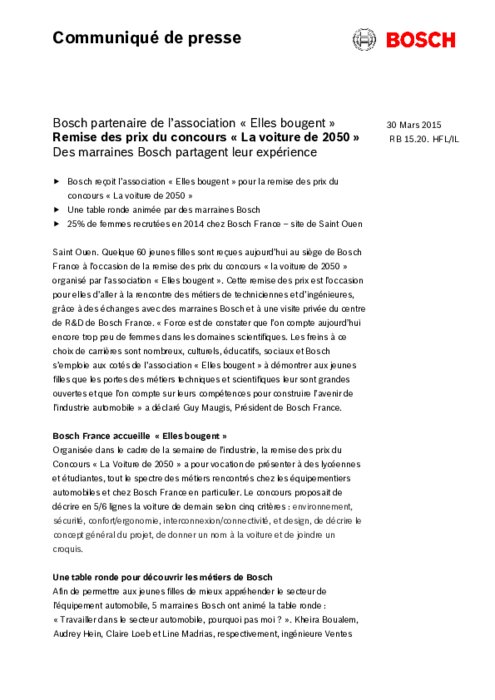 Quelque 60 jeunes filles sont reçues aujourd’hui au siège de Bosch France à l’occasion de la remise des prix du concours « la voiture de 2050 » organisé par l’association « Elles bougent ». Cette remise des prix est l’occasion pour elles d’aller à la rencontre des métiers de techniciennes et d’ingénieures, grâce à des échanges avec des marraines Bosch et à une visite privée du centre de R&D de Bosch France.