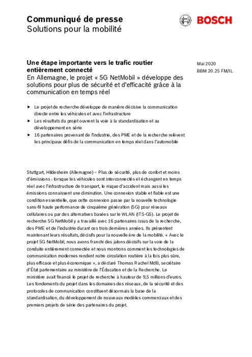 Plus de sécurité, plus de confort et moins d’émissions : lorsque les véhicules sont interconnectés et échangent en temps réel avec l’infrastructure de transport, le risque d’accident mais aussi les émissions connaissent une diminution. Une connexion stable et fiable est une condition essentielle, que cette connexion passe par la nouvelle technologie sans-fil haute performance de cinquième génération (5G) pour réseaux cellulaires ou par des alternatives basées sur le WLAN (ITS-G5)...