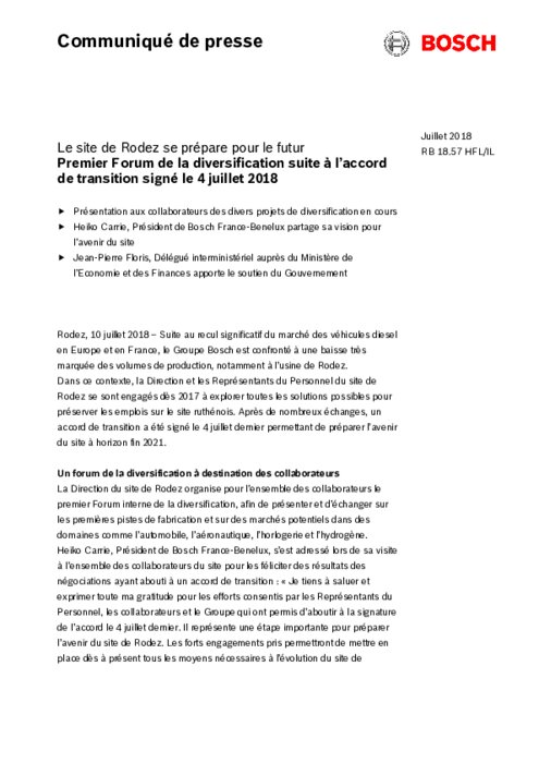 Suite au recul significatif du marché des véhicules diesel en Europe et en France, le Groupe Bosch est confronté à une baisse très marquée des volumes de production, notamment à l’usine de Rodez. Dans ce contexte, la Direction et les Représentants du Personnel du site de Rodez se sont engagés dès 2017 à explorer toutes les solutions possibles pour préserver les emplois sur le site ruthénois. Après de nombreux échanges, un accord de transition a été signé le 4 juillet dernier.