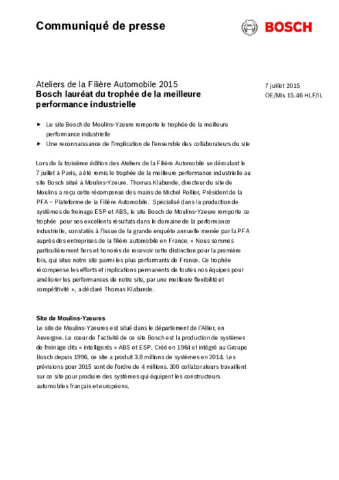 Lors de la troisième édition des Ateliers de la Filière Automobile se déroulant le 7 juillet à Paris, a été remis le trophée de la meilleure performance industrielle au site Bosch situé à Moulins-Yzeure. Thomas Klabunde, directeur du site de Moulins a reçu cette récompense des mains de Michel Rollier, Président de la PFA – Plateforme de la Filière Automobile.