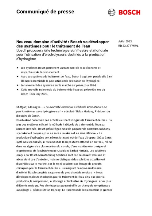 « La neutralité climatique à l’échelle internationale ne peut fonctionner sans hydrogène vert » a déclaré Stefan Hartung, Président du directoire de Bosch. Bosch étend désormais ses activités aux technologies de traitement de l’eau. En plus des systèmes utilisant la méthode habituelle de traitement de l'eau par osmose inversée, Bosch prévoit également de proposer de nouvelles solutions spécialement conçues pour les zones reculées et les sites offshore.