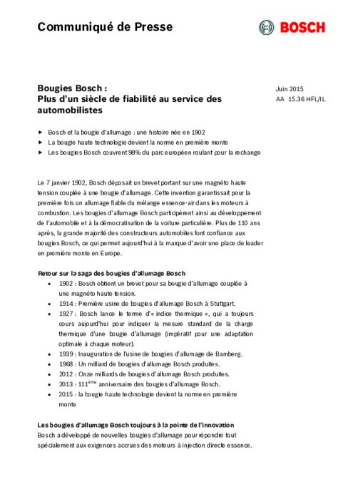 Le 7 janvier 1902, Bosch déposait un brevet portant sur une magnéto haute tension couplée à une bougie d’allumage. Cette invention garantissait pour la première fois un allumage fiable du mélange essence-air dans les moteurs à combustion. Les bougies d’allumage Bosch participèrent ainsi au développement de l’automobile et à la démocratisation de la voiture particulière. Plus de 110 ans après, la grande majorité des constructeurs automobiles font confiance aux bougies Bosch.