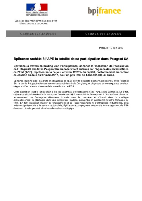 Bpifrance (à travers sa holding Lion Participations) annonce la finalisation de l’acquisition de l’intégralité des titres Peugeot SA précédemment détenus par l’Agence des participations de l’Etat (APE), représentant à ce jour environ 12,23% du capital, conformément au contrat de cession en date du 27 mars 2017, pour un prix total de 1.866.901.334,40 euros.