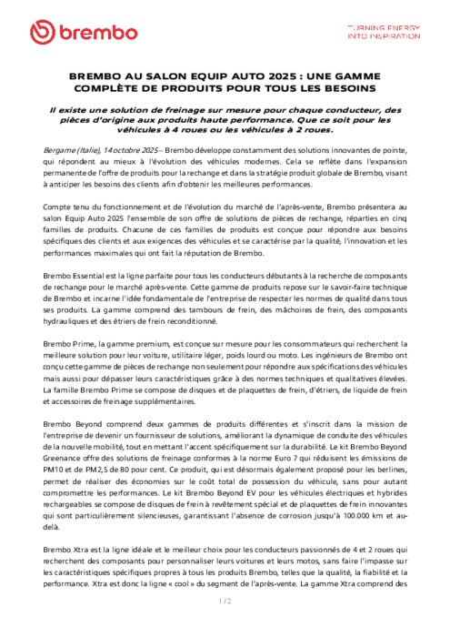 Brembo développe constamment des solutions innovantes de pointe, qui répondent au mieux à l'évolution des véhicules modernes. Cela se reflète dans l'expansion permanente de l’offre de produits pour la rechange et dans la stratégie produit globale de Brembo, visant à anticiper les besoins des clients afin d'obtenir les meilleures performances.