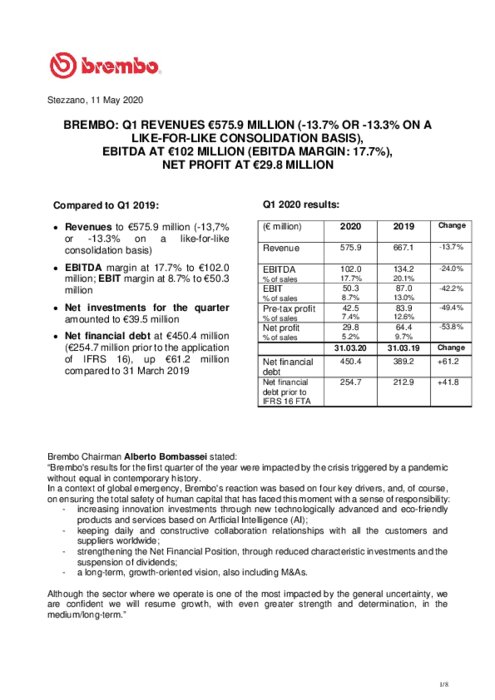 Les résultats de Brembo pour le premier trimestre de l’année ont été impactés par la crise déclenchée par une pandémie sans égale dans l’histoire contemporaine. Dans un contexte d’urgence mondiale, la réaction de Brembo a été basée sur quatre facteurs clés, et, bien sûr, la volonté d’assurer la sécurité totale du capital humain qui a fait face à ce moment avec un sentiment de responsabilité...