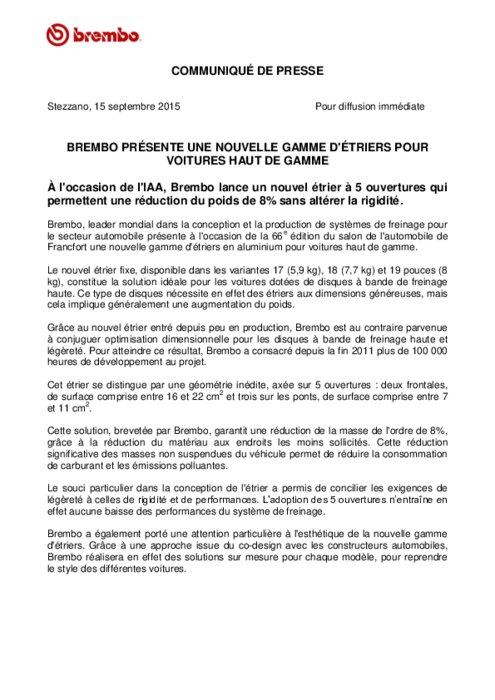 À l'occasion de l'IAA, Brembo lance un nouvel étrier à 5 ouvertures qui permettent une réduction du poids de 8% sans altérer la rigidité. Brembo, leader mondial dans la conception et la production de systèmes de freinage pour le secteur automobile présente à l'occasion de la 66e édition du salon de l'automobile de Francfort une nouvelle gamme d'étriers en aluminium pour voitures haut de gamme.
