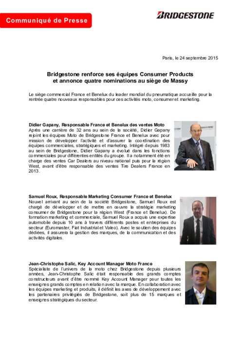 Equipementiers 24 septembre 2015 - 18:23 Bridgestone annonce les nominations de Didier Gapany, Responsable France et Benelux des ventes Moto ; Samuel Roux, Responsable Marketing Consumer France et Benelux ; Jean-Christophe Salic, Key Account Manager Moto France. PDF (75 Ko) Télécharger