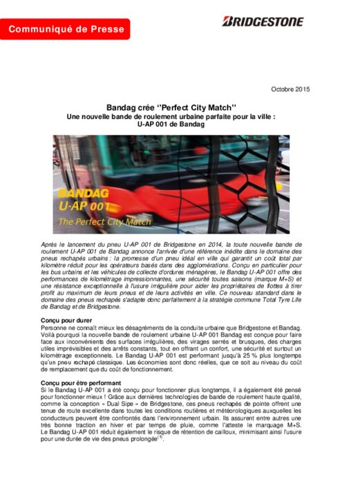 Après le lancement du pneu U-AP 001 de Bridgestone en 2014, la toute nouvelle bande de roulement U-AP 001 de Bandag annonce l'arrivée d'une référence inédite dans le domaine des pneus rechapés urbains : la promesse d'un pneu idéal en ville qui garantit un coût total par kilomètre réduit pour les opérateurs basés dans des agglomérations. Conçu en particulier pour les bus urbains et les véhicules de collecte d'ordures ménagères, le Bandag U-AP 001 offre des performances impressionnantes.