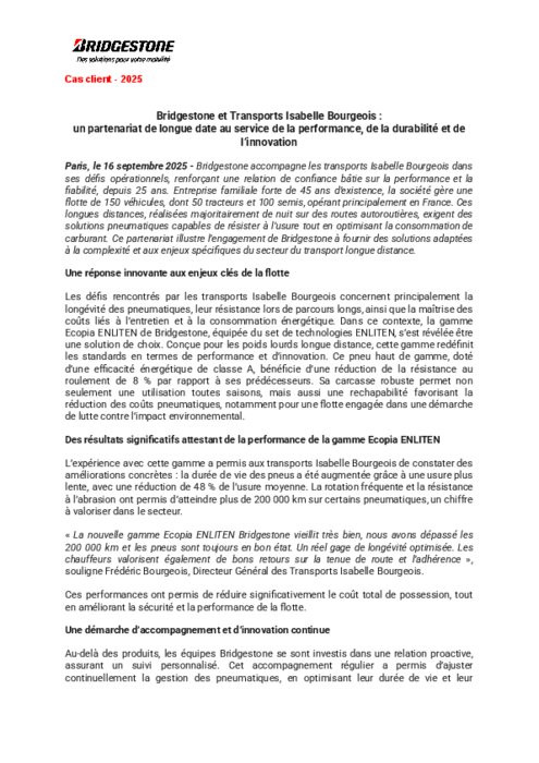 Cet hiver, Bridgestone accompagne les Transports Isabelle Bourgeois dans ses défis opérationnels, renforçant une relation de confiance bâtie sur la performance et la fiabilité depuis 25 ans. Cette entreprise familiale gère une flotte de 150 véhicules, opérant principalement de nuit sur autoroutes françaises, souvent dans des conditions hivernales exigeantes, verglas inclus.