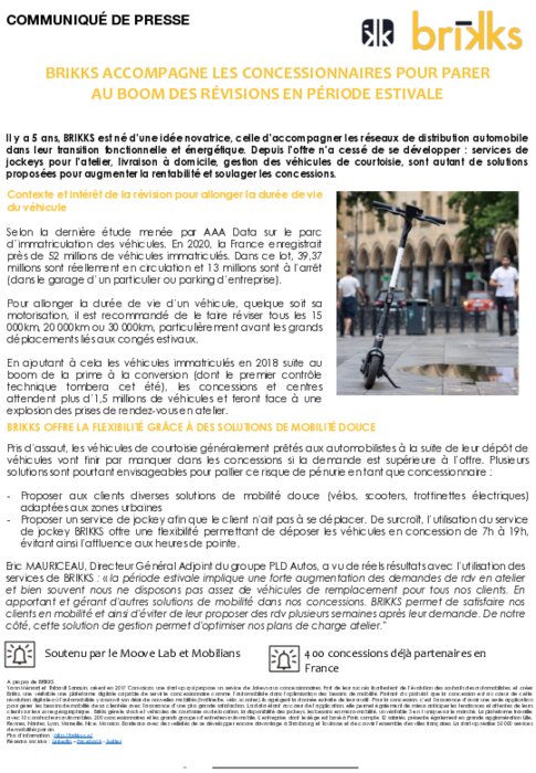 Il y a 5 ans, BRIKKS est né d’une idée novatrice, celle d’accompagner les réseaux de distribution automobile dans leur transition fonctionnelle et énergétique. Depuis l’offre n’a cessé de se développer : services de jockeys pour l’atelier, livraison à domicile, gestion des véhicules de courtoisie, sont autant de solutions proposées pour augmenter la rentabilité et soulager les concessions.