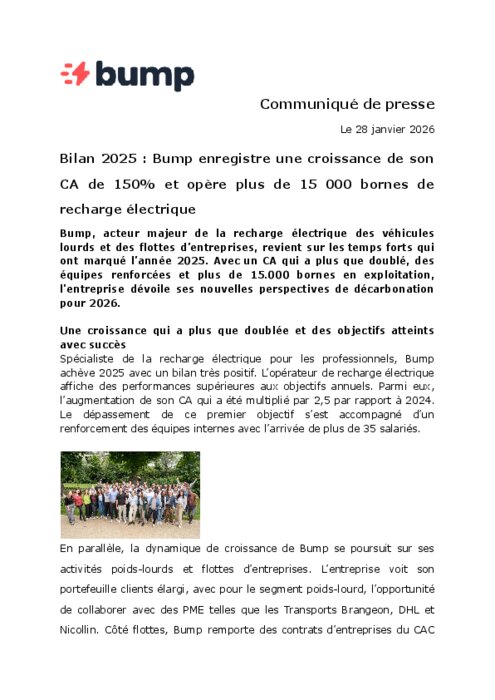 Bump, acteur majeur de la recharge électrique des véhicules lourds et des flottes d’entreprises, revient sur les temps forts qui ont marqué l’année 2025. Avec un CA qui a plus que doublé, des équipes renforcées et plus de 15.000 bornes en exploitation, l’entreprise dévoile ses nouvelles perspectives de décarbonation pour 2026.