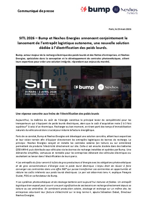 Bump, acteur majeur de la recharge électrique des poids lourds et des flottes d’entreprises, et Nexhos Energies, spécialiste dans la conception et le développement de centrales photovoltaïques, allient leurs expertises pour créer une solution intégrée, répondant aux enjeux du marché.