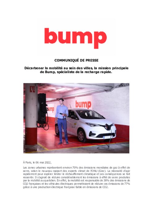 Bump, spécialiste de la recharge rapide à Paris et Lyon, choisit d’être un acteur du changement. Bump agit au quotidien pour une mobilité responsable, avec pour objectif : une société moins carbonée. Et c'est à travers ces actions qu’ils répondent parfaitement à cette mission principale.