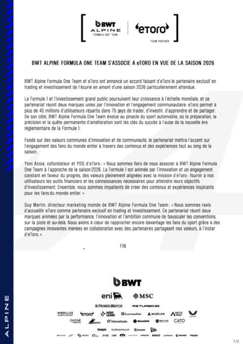 La Formule 1 et l'investissement grand public poursuivent leur croissance à l'échelle mondiale, et ce partenariat réunit deux marques unies par l'innovation et l'engagement communautaire. eToro permet à plus de 40 millions d'utilisateurs répartis dans 75 pays de trader, d'investir, d'apprendre et de partager. De son côté, BWT Alpine Formula One Team évolue au pinacle du sport automobile, où la préparation, la précision et la quête permanente d'amélioration sont les clés du succès à l'aube de la nouvelle ère règlementaire de la Formule 1.