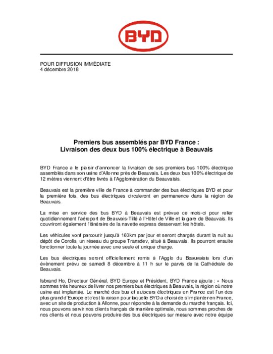 BYD France a le plaisir d’annoncer la livraison de ses premiers bus 100% électrique assemblés dans son usine d’Allonne près de Beauvais. Les deux bus 100% électrique de 12 mètres viennent d’être livrés à l’Agglomération du Beauvaisis. Beauvais est la première ville de France à commander des bus électriques BYD et pour la première fois, des bus électriques circuleront en permanence dans la région de Beauvais.