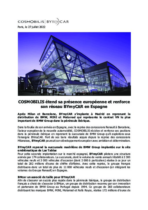 Services 28 juillet 2022 - 10:00 Après Milan et Barcelone, BYmyCAR s’implante à Madrid en reprenant la distribution de BMW, MINI et Motorrad qui représente le contrat VN le plus important de BMW Group dans la péninsule ibérique. PDF (2 Mo) Télécharger