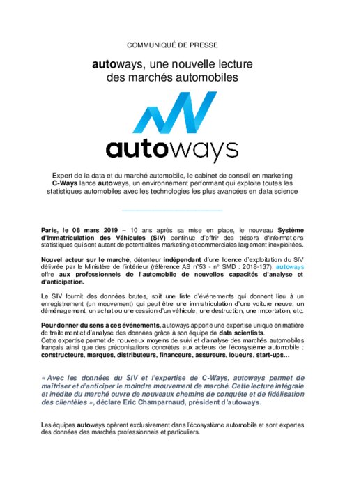 Services 11 mars 2019 - 11:43 Expert de la data et du marché automobile, le cabinet de conseil en marketing C-Ways lance autoways, un environnement performant qui exploite toutes les statistiques automobiles avec les technologies les plus avancées en data science. PDF (411 Ko) Télécharger