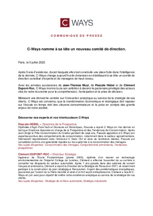 Après 5 ans d’existence, durant lesquels elle s’est construite une place forte dans l’intelligence de la donnée, C-Ways change aujourd’hui de dimension en établissant à sa tête un comité de direction constitué d’experts et de managers de haut niveau. Avec les arrivées successives de Jean-Thomas Muyl, de Pascale Hébel et de Clément Dupont-Roc, C-Ways montre toute son ambition à devenir le partenaire privilégié des acteurs clés de notre économie pour la compréhension.