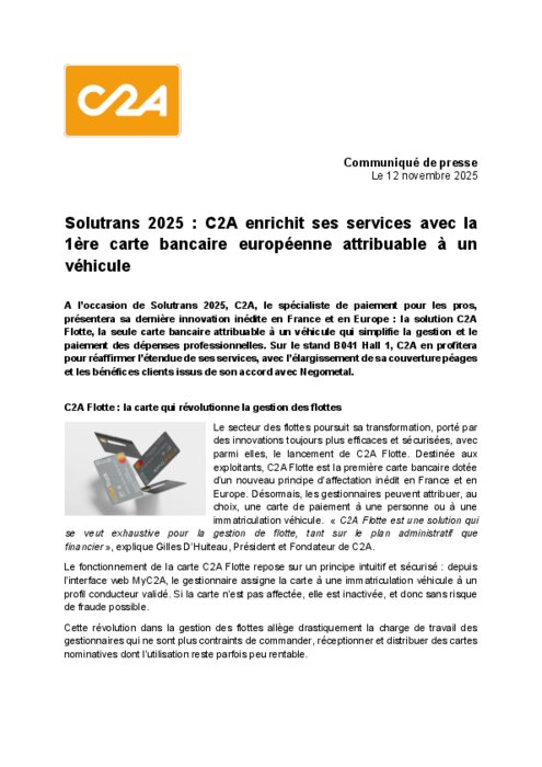 A l’occasion de Solutrans 2025, C2A, le spécialiste de paiement pour les pros, présentera sa dernière innovation inédite en France et en Europe : la solution C2A Flotte, la seule carte bancaire attribuable à un véhicule qui simplifie la gestion et le paiement des dépenses professionnelles. Sur le stand B041 Hall 1, C2A en profitera pour réaffirmer l’étendue de ses services, avec l’élargissement de sa couverture péages et les bénéfices clients issus de son accord avec Negometal.