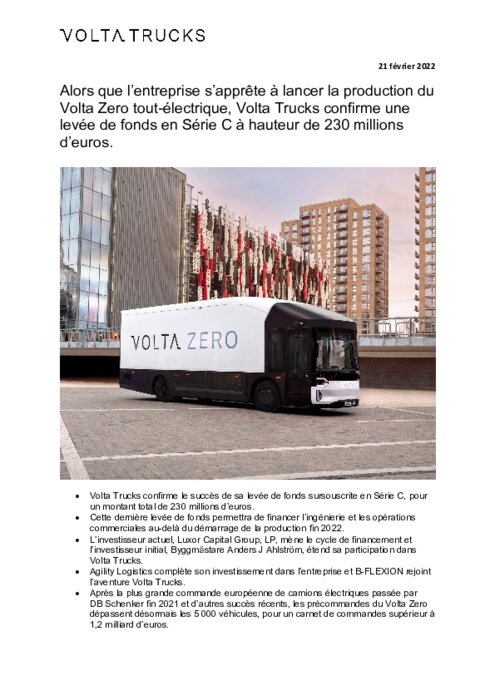 "Cette dernière levée de fonds financera toutes les opérations d'ingénierie et les opérations commerciales de l'entreprise, au-delà du démarrage de la production en série du Volta Zero 100% électrique de 16 tonnes, fin 2022", a précisé la société dans un communiqué.