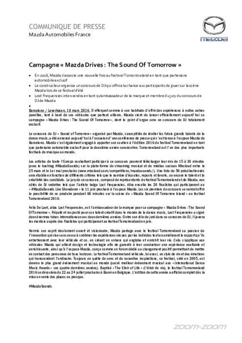 En 2016, Mazda s'associe une nouvelle fois au festival Tomorrowland en tant que partenaire automobile exclusif. Le constructeur organise un concours de DJ qui offrira la chance aux participants de jouer sur la scène Mazda lors de ce festival d'été. Lost Frequencies interviendra en tant qu'ambassadeur de la marque et membre du jury du concours de DJ de Mazda.