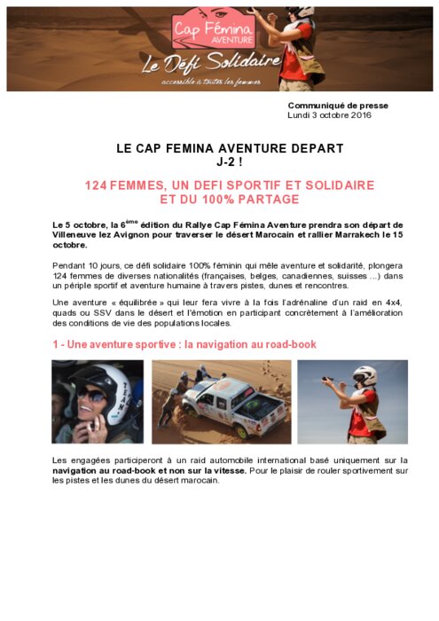 Le 5 octobre, la 6ème édition du Rallye Cap Fémina Aventure prendra son départ de Villeneuve lez Avignon pour traverser le désert Marocain et rallier Marrakech le 15 octobre. Pendant 10 jours, ce défi solidaire 100% féminin qui mêle aventure et solidarité, plongera 124 femmes de diverses nationalités (françaises, belges, canadiennes, suisses