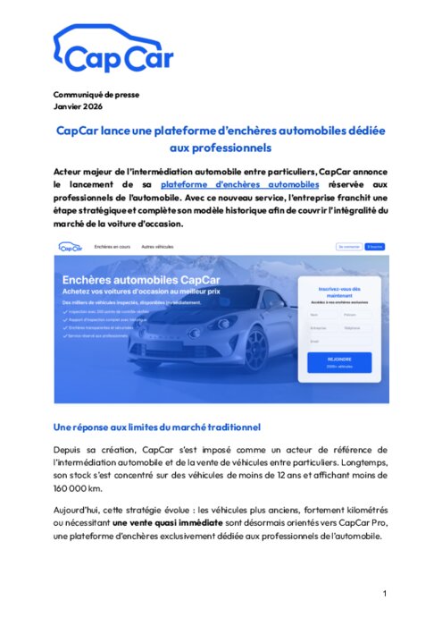 Acteur majeur de l’intermédiation automobile entre particuliers, CapCar annonce le lancement de sa plateforme d’enchères automobiles réservée aux professionnels de l’automobile. Avec ce nouveau service, l’entreprise franchit une étape stratégique et complète son modèle historique afin de couvrir l’intégralité du marché de la voiture d’occasion.