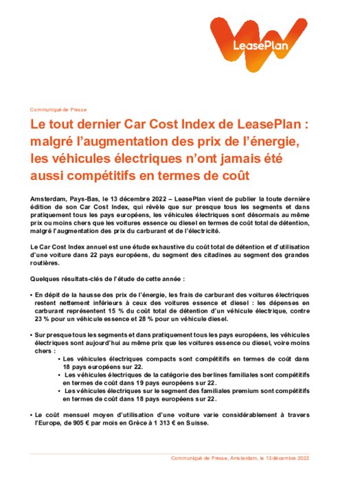 Car Cost Index LeasePlan 2022 : les VE n'ont jamais été aussi compétitifs en termes de coût