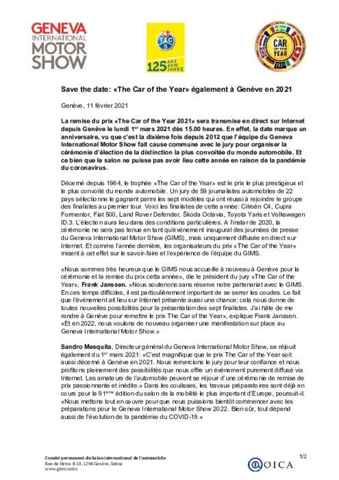 La remise du prix «The Car of the Year 2021» sera transmise en direct sur Internet depuis Genève le lundi 1er mars 2021 dès 15.00 heures. En effet, la date marque un anniversaire, vu que c’est la dixième fois depuis 2012 que l’équipe du Geneva International Motor Show fait cause commune avec le jury pour organiser la cérémonie d’élection de la distinction la plus convoitée du monde automobile. Et ce bien que le salon ne puisse pas avoir lieu cette année en raison de la pandémie du coronavirus.