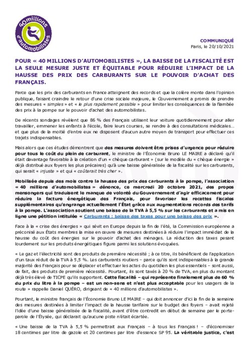 40 MA dénonce des propos mensongers qui traduisent le manque de volonté du Gouvernement d'agir efficacement pour réduire la facture énergétique des Français, pour favoriser les recettes fiscales supplémentaires qu'engrange actuellement l'État grâce aux augmentations records des tarifs à la pompe. L'association soutient une baisse de la TVA à 5,5 % sur les carburants et a mis en ligne une pétition intitulée « Carburants : baisse des taxes pour une baisse des prix ».