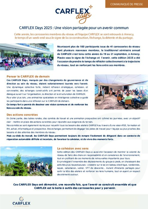 Réunissant plus de 100 participants issus de 41 carrosseries du réseau dont plusieurs nouveaux membres, le traditionnel séminaire annuel de Carflex s’est tenu cette année du 19 au 21 septembre, à Annecy. Placée sous le signe de l’échange et l’avenir, cette édition 2025 a été l’occasion de prendre le temps de réfléchir collectivement à la trajectoire du réseau, tout en renforçant les liens entre ses membres.