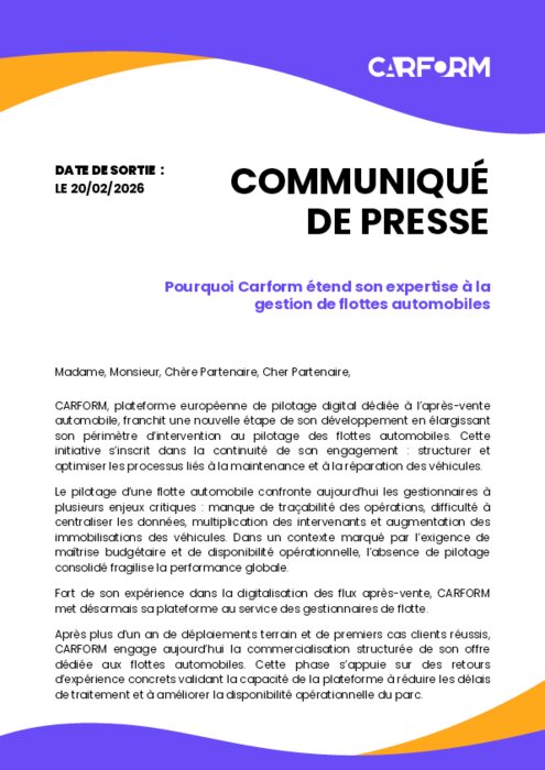 Carform, plateforme européenne de pilotage digital dédiée à l’après-vente automobile, franchit une nouvelle étape de son développement en élargissant son périmètre d’intervention au pilotage des flottes automobiles. Cette initiative s’inscrit dans la continuité de son engagement : structurer et optimiser les processus liés à la maintenance et à la réparation des véhicules.
