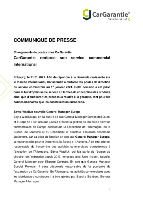 Afin de répondre à la demande croissante sur le marché international, CarGarantie a renforcé les postes de direction du service commercial au 1er janvier 2021. Cette décision a été prise dans le but d’optimiser le service en termes de conception des produits ainsi que d’améliorer les processus relatifs à la garantie, tant pour les concessionnaires que les constructeurs européens.