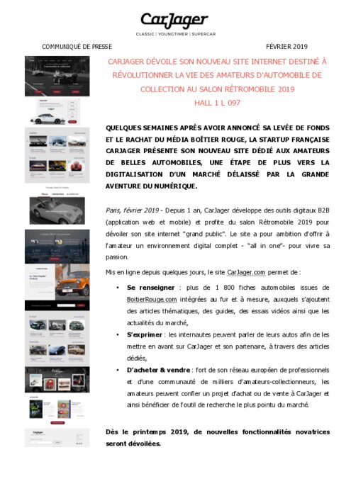 Depuis 1 an, CarJager développe des outils digitaux B2B (application web et mobile) et profite du salon Rétromobile 2019 pour dévoiler son site internet "grand public”. Le site a pour ambition d'offrir à l'amateur un environnement digital complet - "all in one"- pour vivre sa passion.
