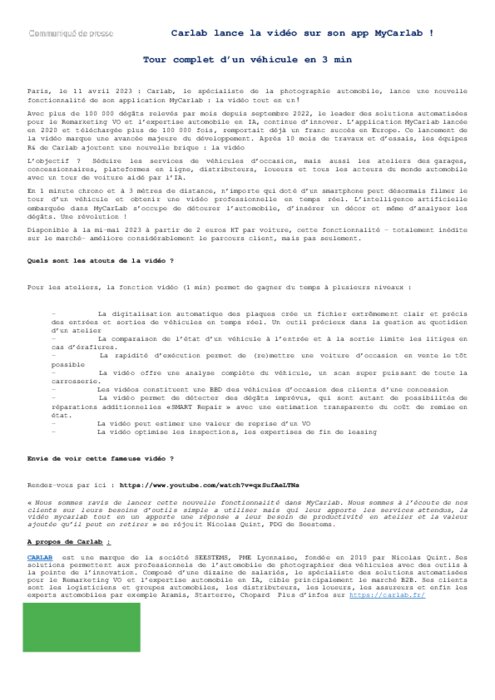 Avec plus de 100 000 dégâts relevés par mois depuis septembre 2022, le leader des solutions automatisées pour le Remarketing VO et l’expertise automobile en IA, continue d’innover. L’application MyCarlab lancée en 2020 et téléchargée plus de 100 000 fois, remportait déjà un franc succès en Europe. Ce lancement de la vidéo marque une avancée majeure du développement. Après 10 mois de travaux et d’essais, les équipes R& de Carlab ajoutent une nouvelle brique : la vidéo.